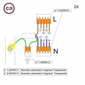 Accessory kit for four-hole ceiling rose cabling. The kit includes two 5-pole transparent universal terminals and one 2-pole transparent universal terminal.The transparent container allows you to clearly see if the wires are well connected and stripped at the correct length.Suitable for hosting rigid or flexible electrical cables with a section...