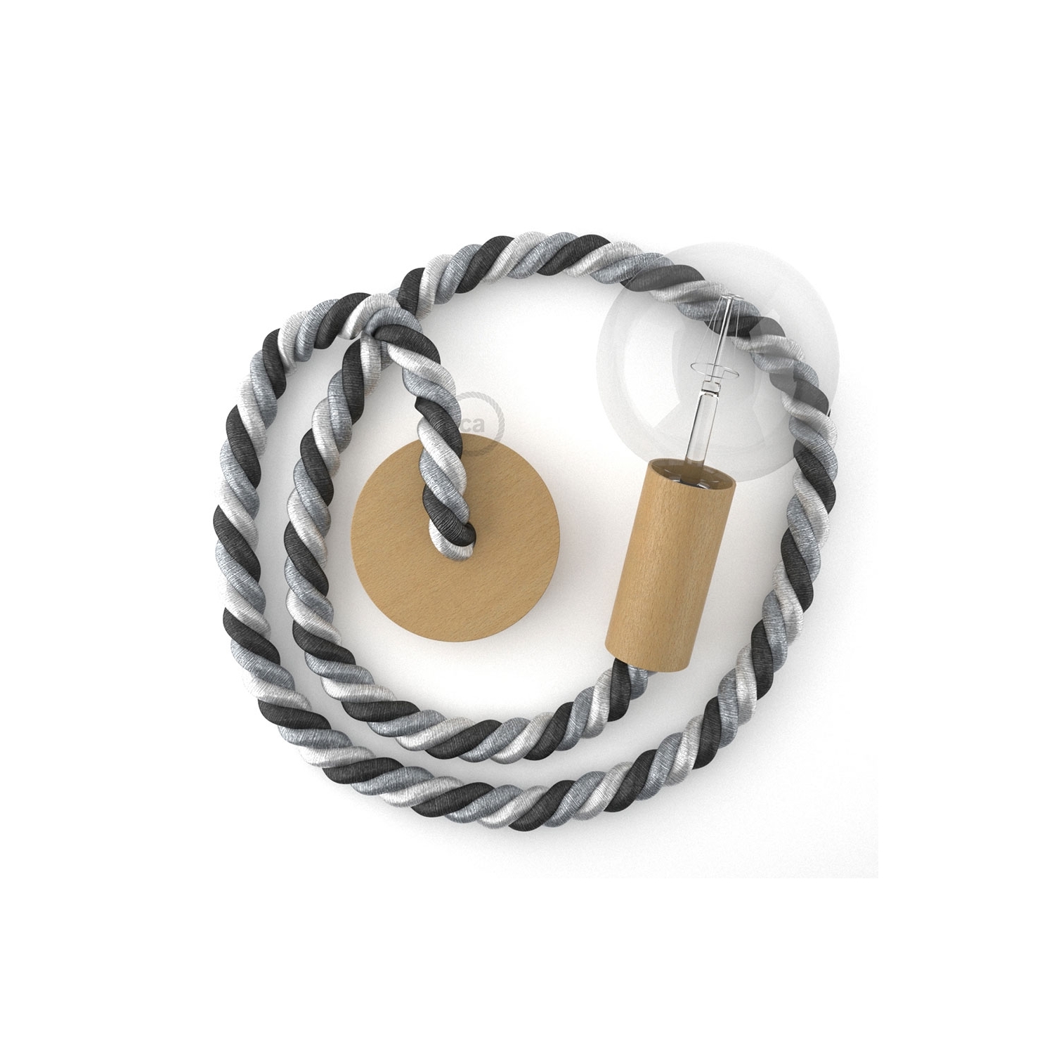 Wooden Pendant, suspended lamp with nautical 2XL 24mm rope in bright fabric Orleans, Made in Italy